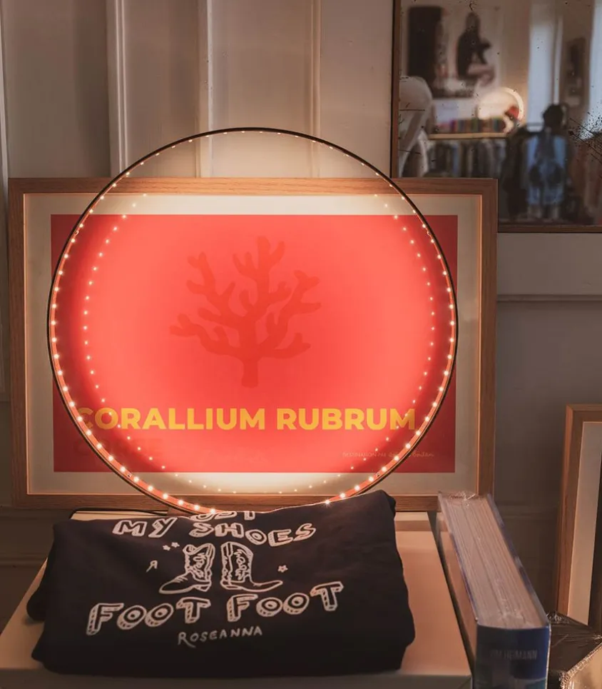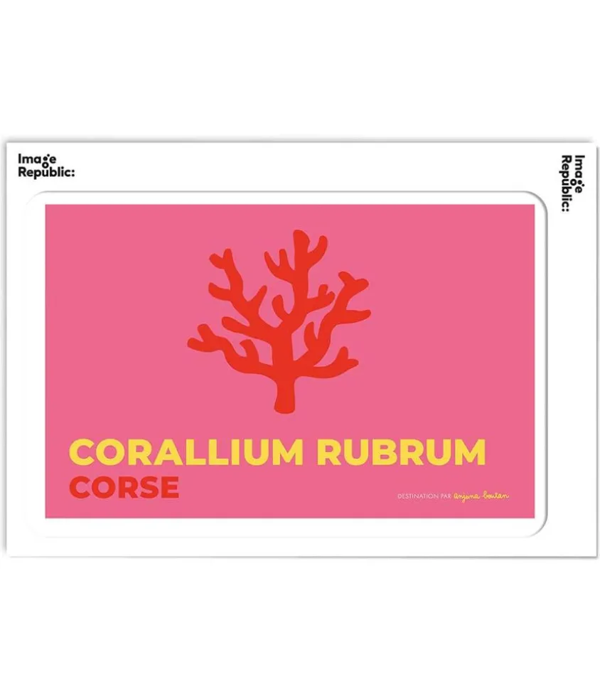 Affiche Corse Issue De La Collection Destination Par Anjuna Boutan Pour La Marque Image Republic. L’Inscription Jaune « Corallium Rubrum » Vient Contraster Le Fond Rose De Cette Affiche Ainsi Que L’Illustration De Corail Dans Le Même Coloris Rouge Que L’Insription « Corse ».