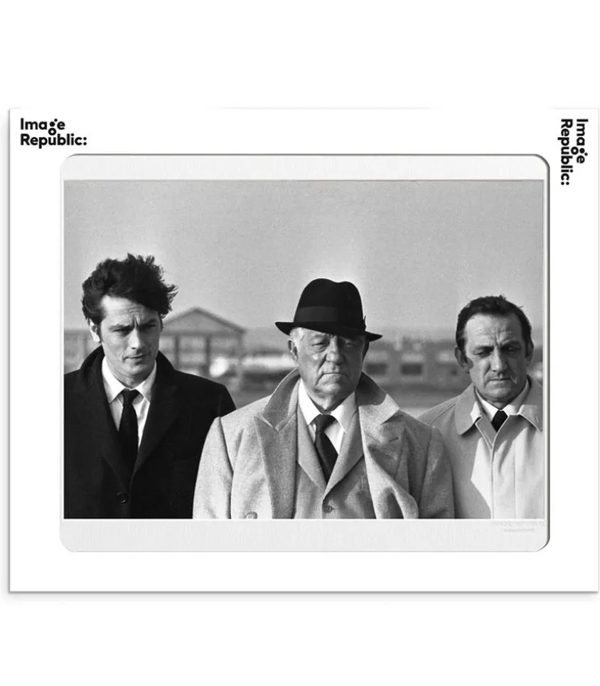 Affiche La Galerie Sicilien Éditée Par Image Republic Au Format 40 X 50 Cm, Un Sobre Tirage En Noir Et Blanc Représentant Les Acteurs Principaux Du Film Le Clan Des Siciliens, Alain Delon, Jean Gabin Et Lino Ventura, Marchant Côte À Côte.