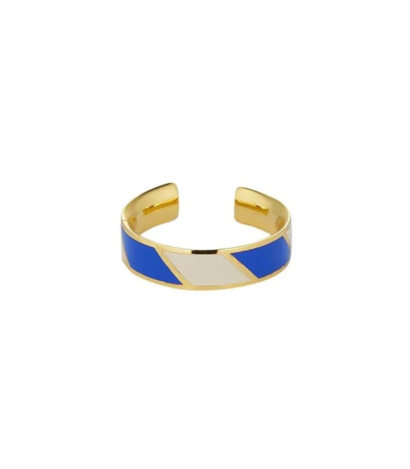 Bague Ajustable De La Marque Design Letters, Une Jolie Bague Ouverte En Acier Inoxydable Doré, Agrémentée De Détails Rayures Émailés De Coloris Blanc Et Bleu Cobalt. Fine Et Élégante, Elle Est Idéale À Porter En Accumulation, Ou À Offrir En Cadeau.