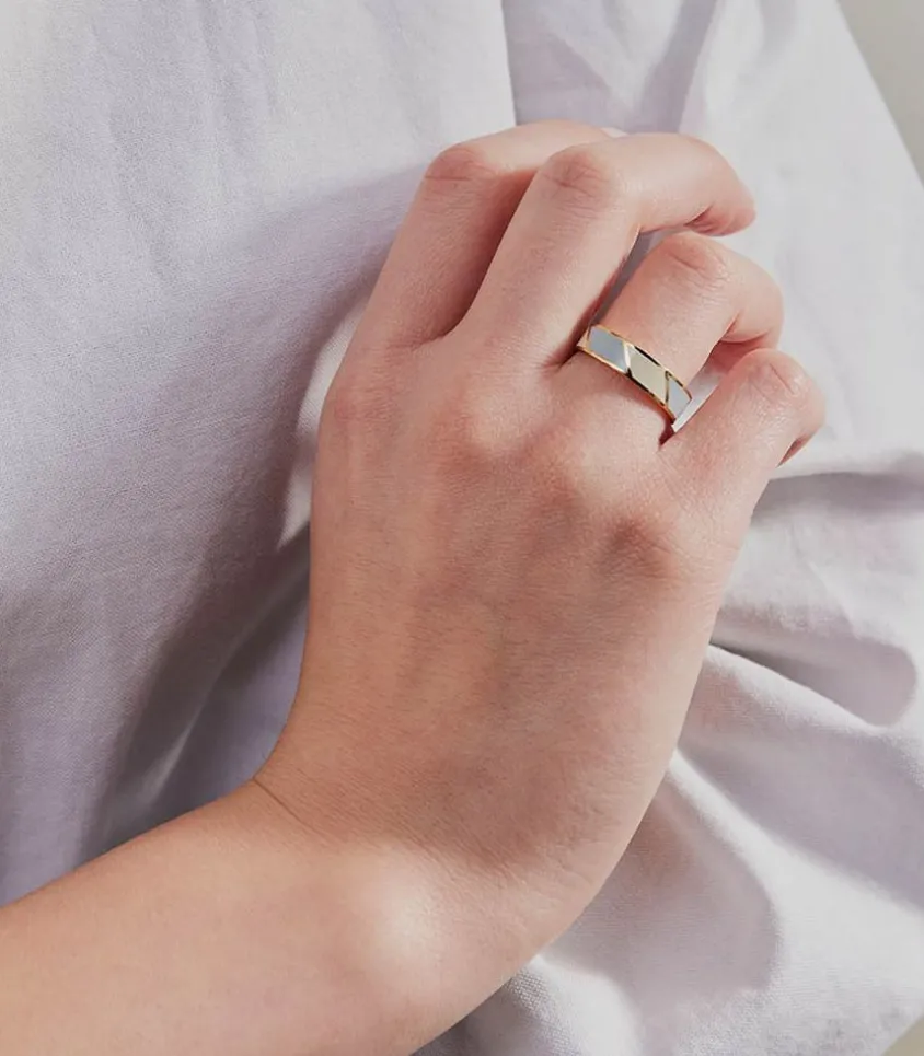 Bague Ajustable Striped Candy Light Blue De La Marque Design Letters, En Acier Inoxydable Doré Et Émail Mêlant Bleu Et Blanc Façon Rayures Larges Et Diagonales. Cette Bague S’Ajuste À Tous Les Doigts Grâce À Son Ouverture Au Dos, Et Fera Ainsi Un Parfait Cadeau Pour Un Proche.