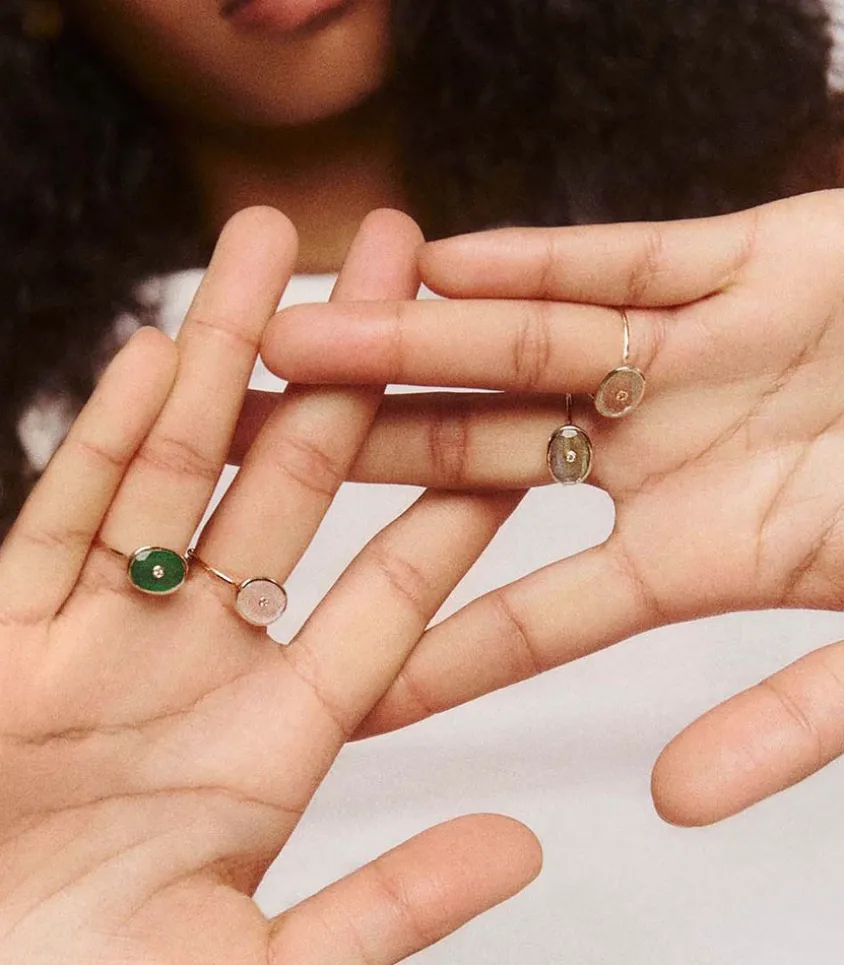 Bague Orso En Version Labradorite Par Pascale Monvoisin. Délicatement Montée Sur Un Anneau En Or Jaune, Une Labradorite Taillée Et Sertie D’Un Petit Diamant Vient Illuminer Et Apporter Une Touche De Couleur À La Main. On La Porte Seule Ou En Accumulation Avec D’Autres Modèles Orso.