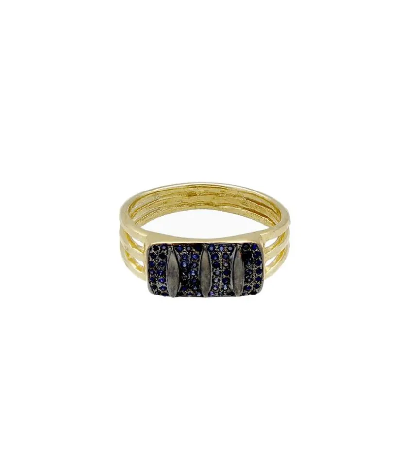 Comme Une Ode À La Joaillerie Fine Et Précieuse, La Maison 5 Octobre Conçoit Cette Jolie Bague Épaisse Peter, Confectionnée En Argent Doré À L’Or 24 Carats Et En Argent Noirci. Elle Présente 3 Anneaux Dorés En Guise De Base, Légèrement Espacés Au Devant Pour Pouvoir Accueillir Une Chevalière Rectangulaire Sertie De Multiples Petits Saphirs Bleus, Séparés Par Des Empiècements Verticaux. Un Bijou D’Une Préciosité Rare Au Coloris Royal.