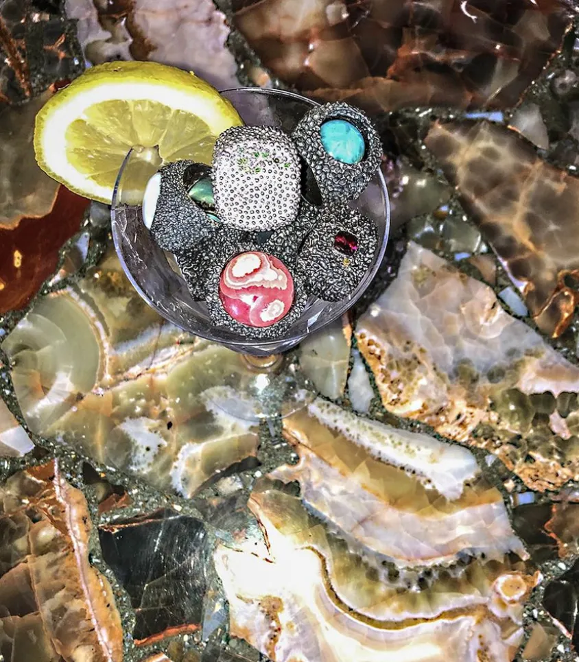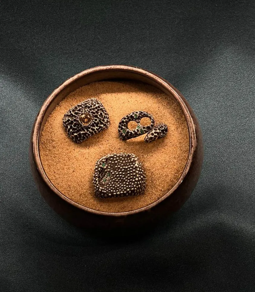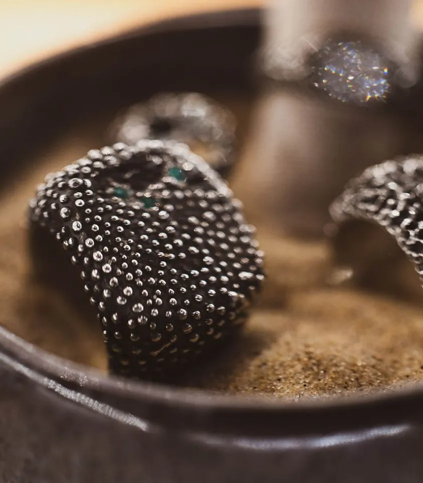 Bague Supergreen Imaginée Par Le Joaillier Ylang Ravel Pour Sa Maison Éponyme. Inspiré Par Une Technique Antique Égyptienne, La Granulation, Il Dévoile Une Chevalière En Argent Unisexe Recouverte De Billes D’Argent Et Incrustée De Sept Émeraudes.