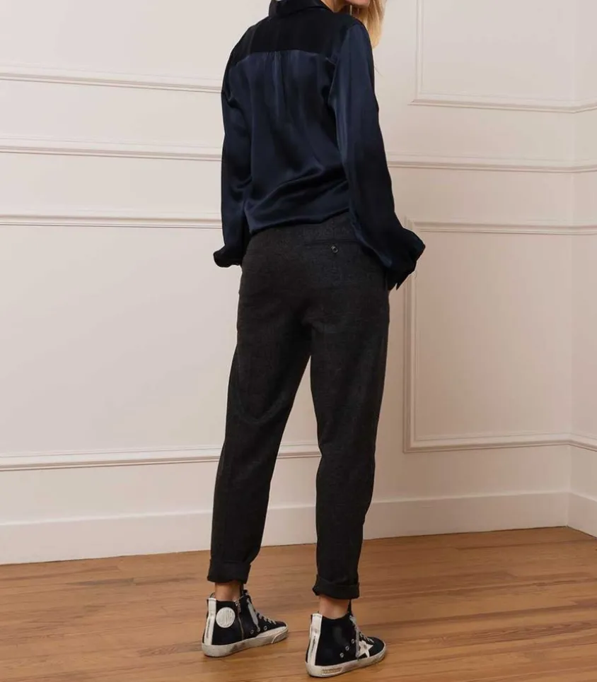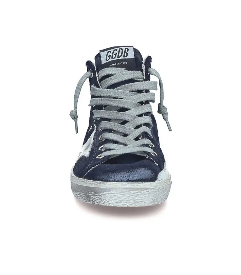 Baskets Francy Classic Cuir Suédé Marine Signées Golden Goose À L’Effet Usé, Lacets Gris, Avec L’Emblématique Étoile De La Marque Sur Le Côté Extérieur En Cuir Blanc, Fermeture Éclair Et Patch Rond Imprimé Golden Côté Interne, Usé Et Fini À La Main En Italie.