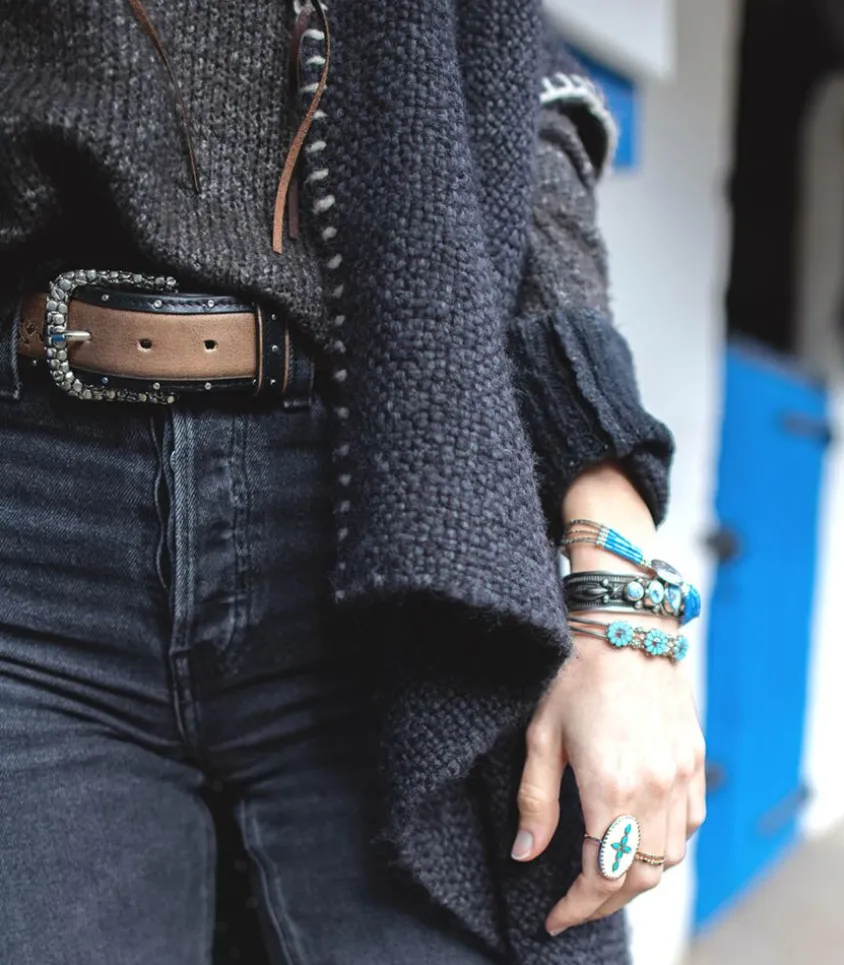 Bracelet Sunfaces Turquoise Sleeping Beauty De La Marque Harpo, Base Jonc En Double Rang Agrémentée De 3 Petites Fleurs D’Inspiration Amérindiennes Conçues En Pierres Turquoises Sleeping Beauty D’Arizona, Jais, Corail Et Nacres. De Petites Fleurs En Argent Complètent Son Design Au Centre.