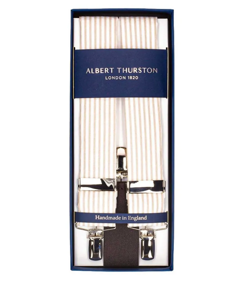 Bretelles Sutting 3 Clip À Rayures Beige Et Blanche De La Marque Albert Thurston. Unisexe, Ce Modèle À La Fois Intemporel Et Fonctionnel Apporte Une Note Vintage À Une Tenue. On Les Porte Avec Un Pantalon Carotte Et Un Léger Pull À Manches Longues.