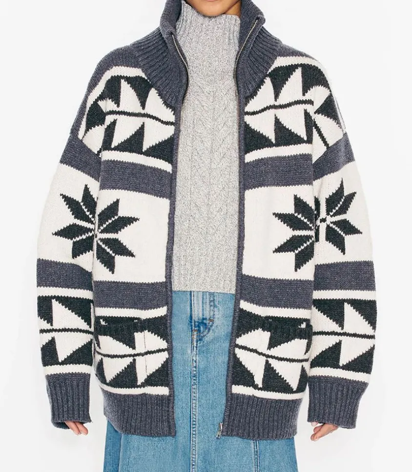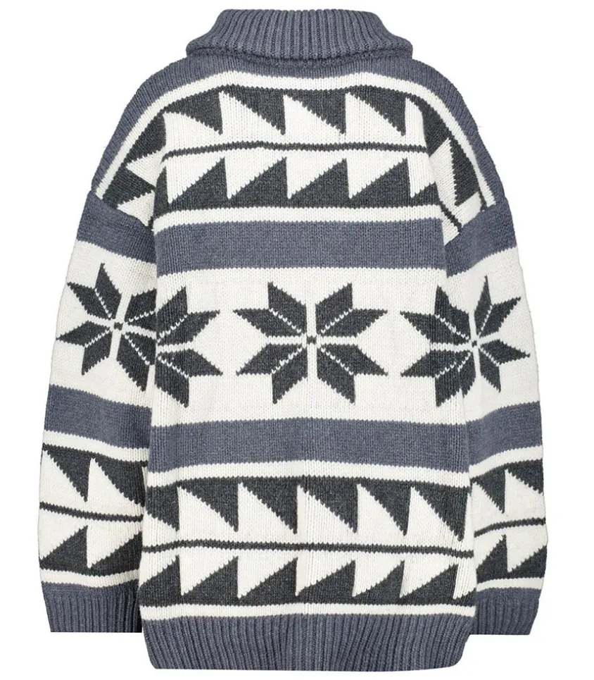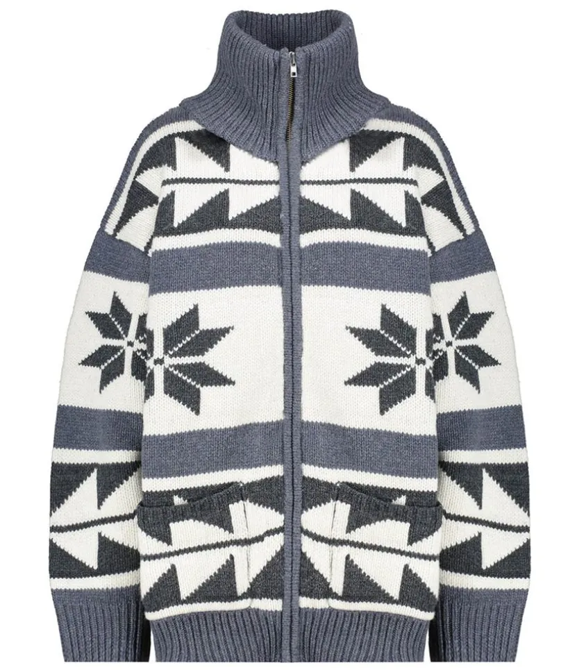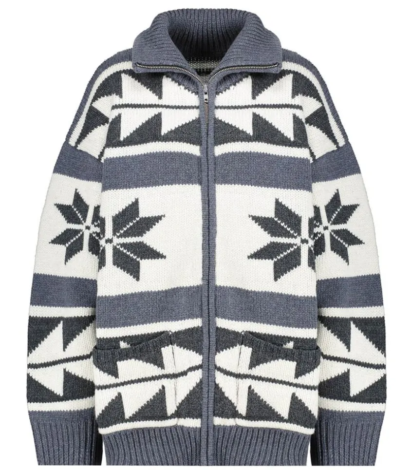 Cardigan Zippé En Laine Mérinos Gris Signé Margaux Lonnberg, Inspiré Des Pulls De Sports D’Hiver Des Années 80 Avec Ses Motifs Étoiles Et Ses Rayures.