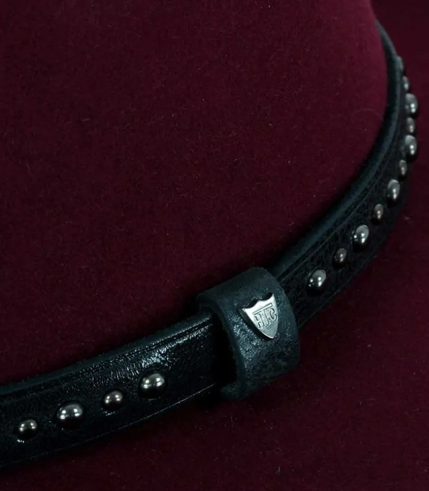D’Une Hauteur De 10,5 Cm, Il Se Démarque Par Ses Larges Bords De 8 Cm Et Sa Bride En Cuir Cloutée Sur Le Tour De Tête.