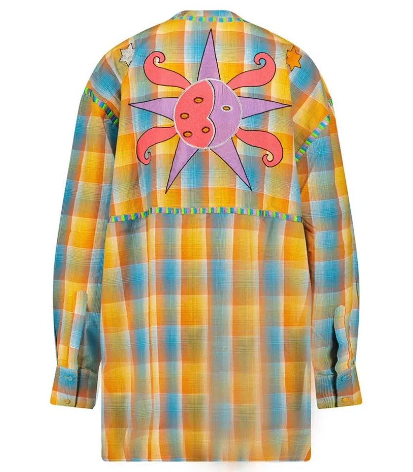 Chemise Faitch Cairo Range Blue De La Marque Monoki, Une Pièce Véritablement Originale Et Colorée En Tissus À Carreaux. Avec Ses Teintes Principalement Orange Et Bleu. On Retrouve De Multiples Détails Brodés Astraux Sur Le Buste Et Au Dos.