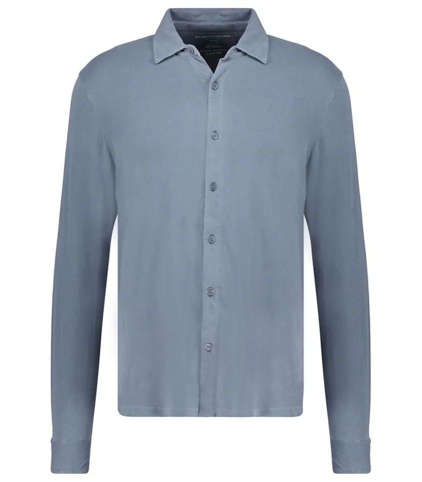 Chemise Manches Longues Homme Herman Blue Denim De La Marque Majestic Filatures. Conçue Sur Une Base De Coton Et Élasthanne, Elle Offre Un Toucher Doux Et Agréable À Porter, Tout En Confort. Son Coloris Bleu Gris Classique Ira Aussi Bien Avec Un Jean Qu’Un Chino Marine.