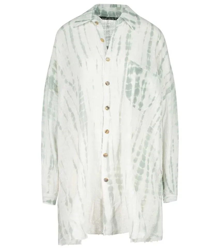 Chemise Oversize Mykonos Tie & Dye Water Green De La Maison Saint Julien, La Chemise Estivale Qu’Il Vous Faut Pour Traîner En Ville Ou S’Offrir Un Moment Détente À La Plage. Sa Coupe Fluide Et Évasée Lui Offrent Un Tombé Parfait Et Son Tissus Léger Est Idéal Pour Les Fortes Chaleurs. On Aime Ses Boutons En Coquillage Naturel, Son Imprimé Tie & Dye Tendance Et Ses Fintions Brutes. Les Manches Sont 3/4 Et Retroussées Pour Se Porter De Manière Détendue.