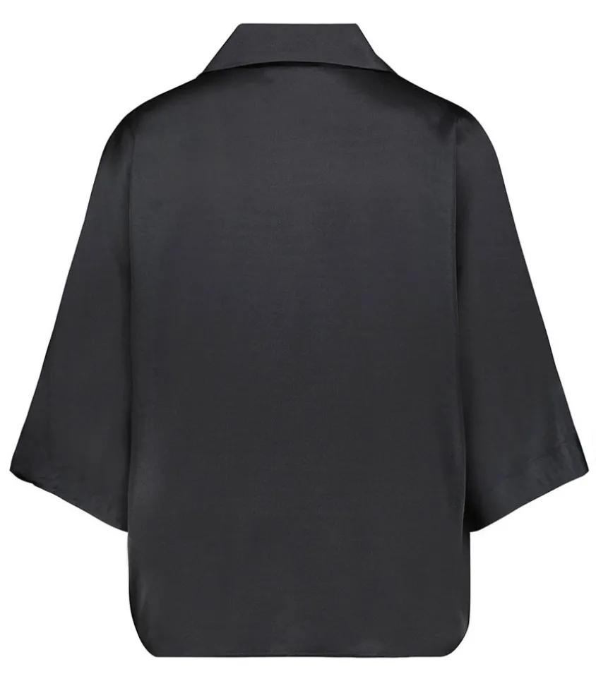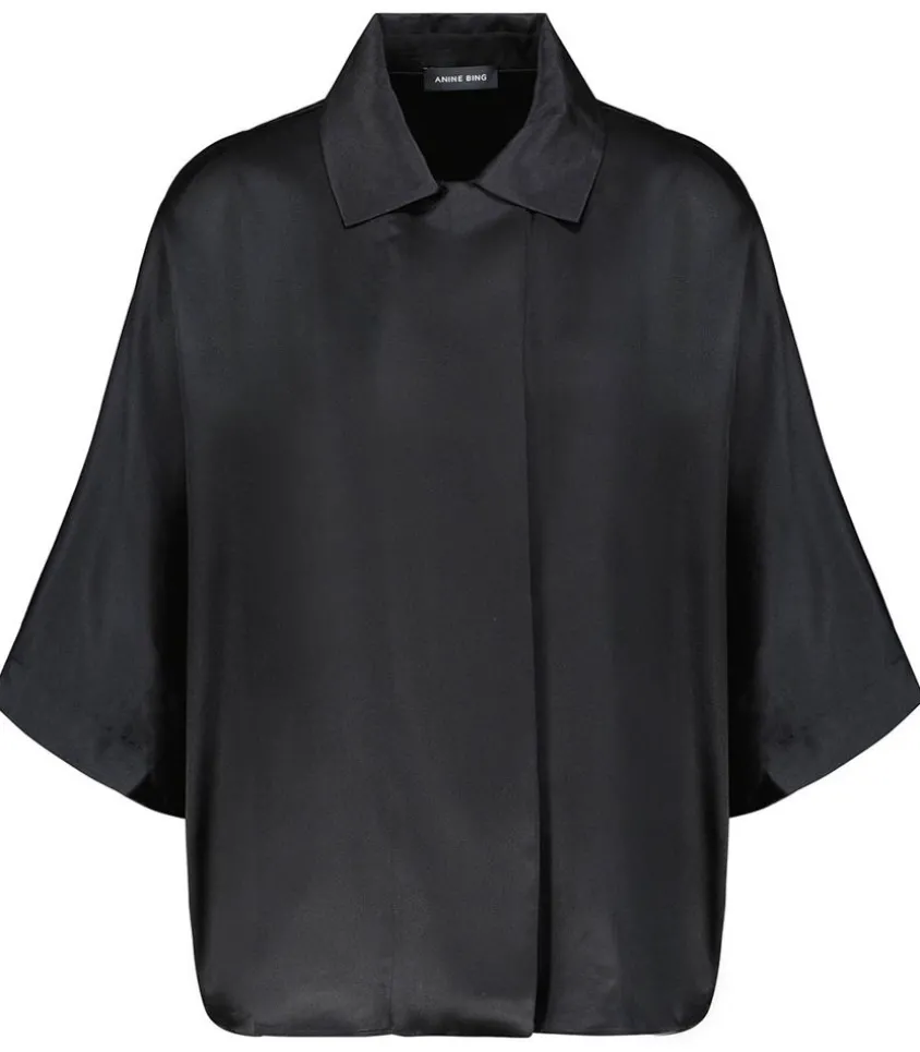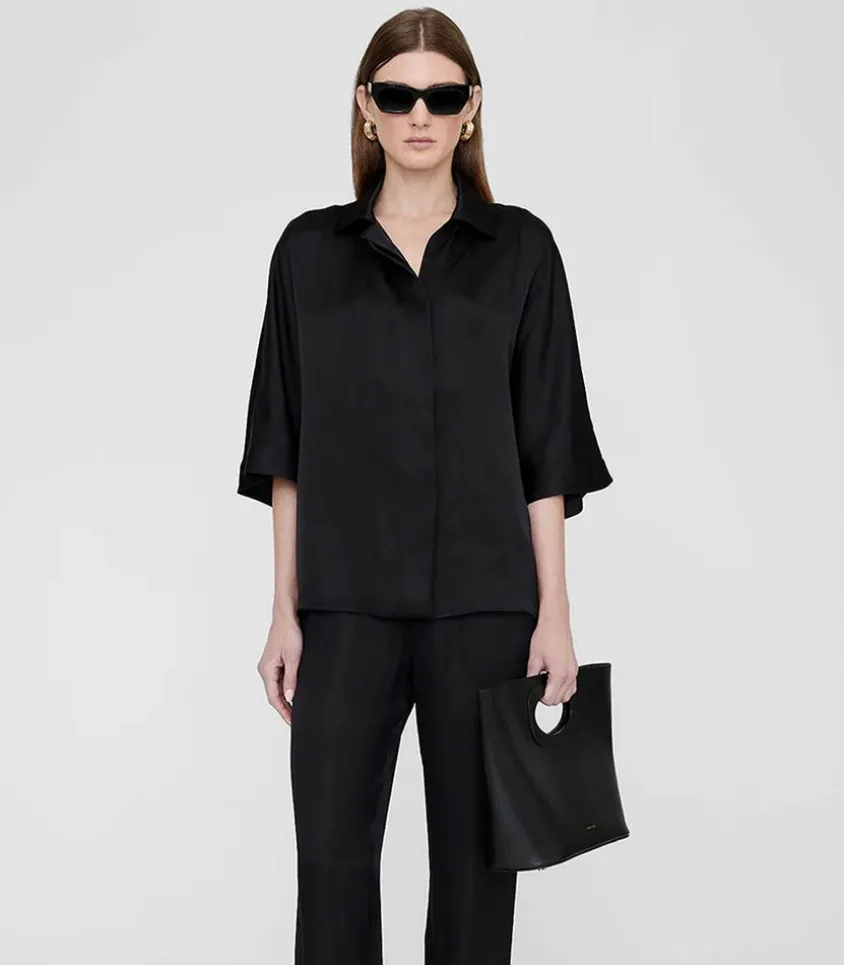 Chemisier Julia Noir De La Marque Anine Bing, À La Coupe Loose Et Élégante Avec Des Manches À Volume, Un Col Classique Ainsi Qu’Une Fermeture Boutonnée Et Camouflée Devant, Imitant Une Cravate Souple. Manches Coudes Évasées Pour Un Joli Effet Voile. Voir La Taille Du Mannequin