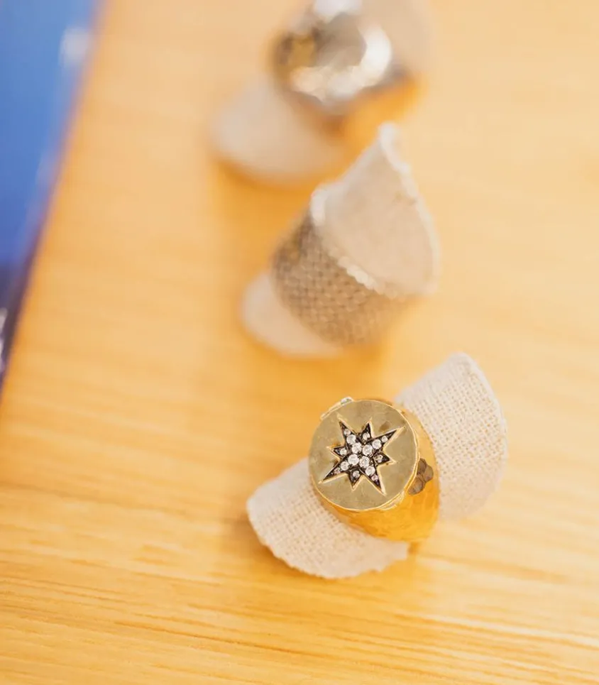 Chevalière Constellation Secret Feidt Paris En Or Jaune 9 Carats, Pavée De 16 Saphirs Blancs. Un Bijou Précieux Et Élégant Qui Durera Dans Le Temps.