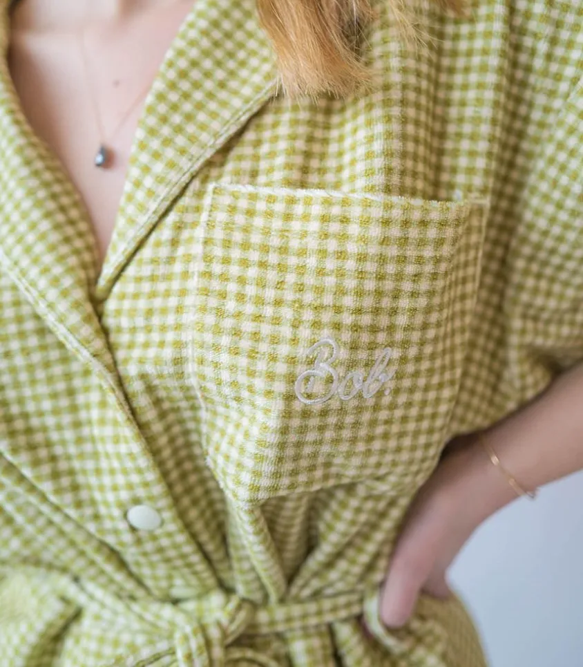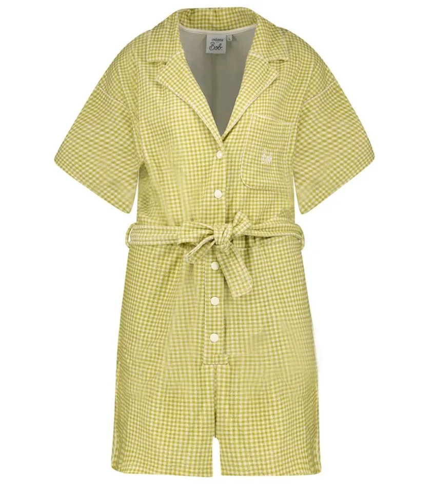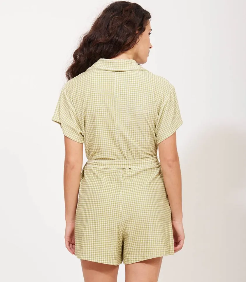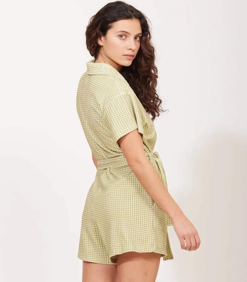 Combishort Ibiza Vichy Vert De La Marque Welcome Bob, Un Combishort Conçu Au Portugal En Coton Biologique Que L’On Retrouve Dans Une Version Au Motif Vichy Vert. On L’Imagine Avec Une Paire De Baskets.