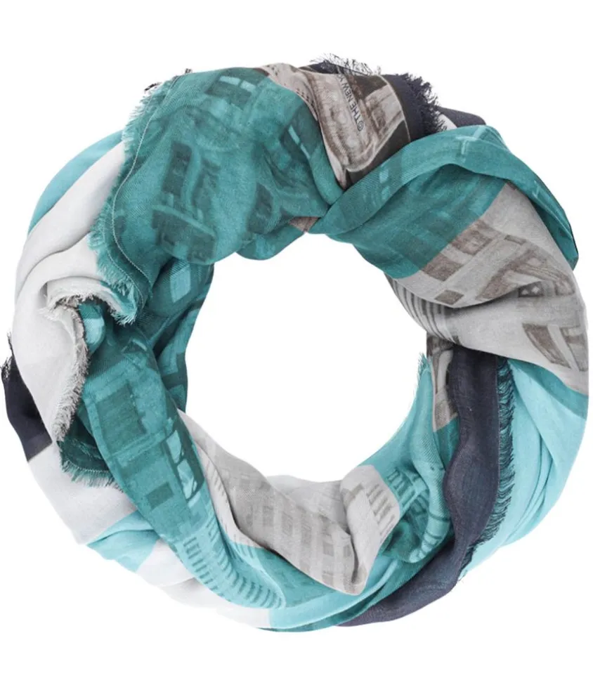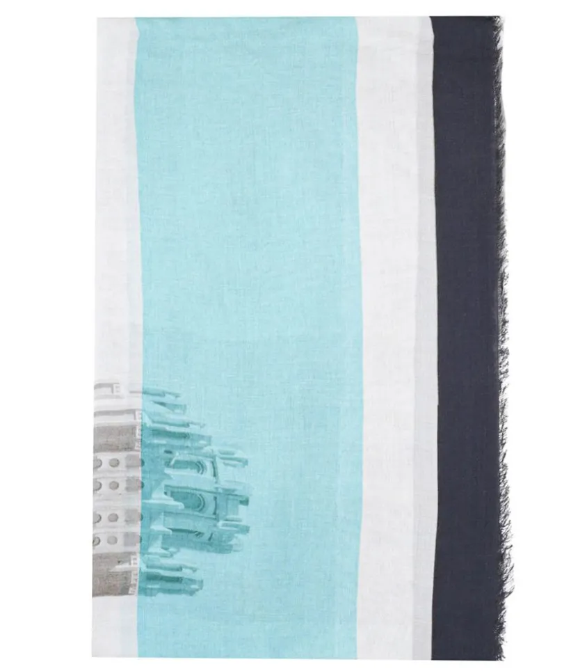 Étole Big Roll De La Marque Faliero Sarti. Une Étole Aux Doux Coloris Bleu Blanc Et Noir Pourvue D’Une Illustration À Porter Tout Au Long De L’Année. C’Est L’Accessoire Idéal Qui Apportera Une Touche Chic À N’Importe Quelle Tenue, Tout En Alliant Confort Et Style.