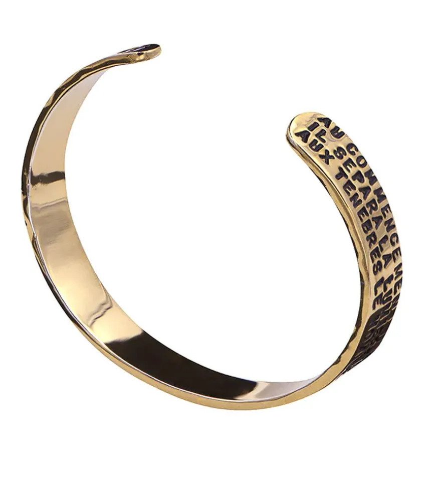 Bracelet Jonc « Génèse » En Argent Doré À L’Or Fin 24 Carats Signé Serge Thoraval. Il Est Orné D’Une Gravure Sur 3 Lignes Qui Dit « Au Commencement Dieu Créa Le Ciel Et La Terre. Il Dit : Que La Lumière Soit Faite. Il Sépara La Lumière Avec Les Ténèbres. Il Donna À La Lumière Le Nom De Jour Et Aux Ténèbres Le Nom De Nuit. Ainsi Se Fit Le Premier Jour ». Une Pièce D’Une Poésie