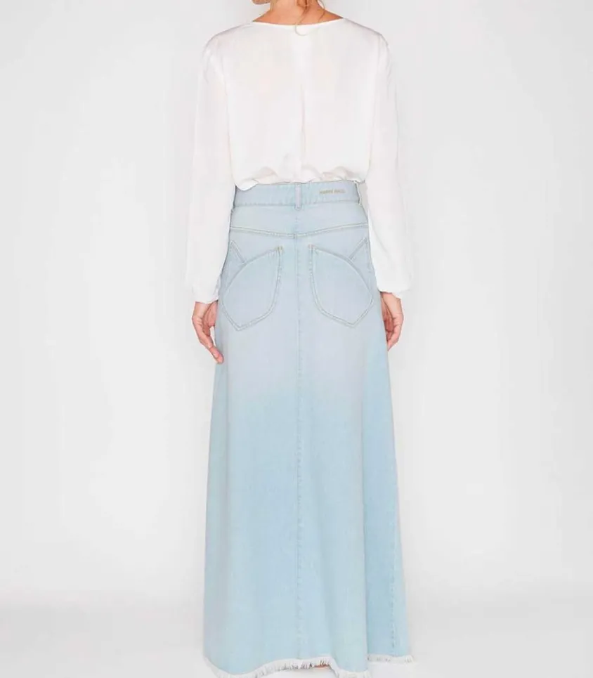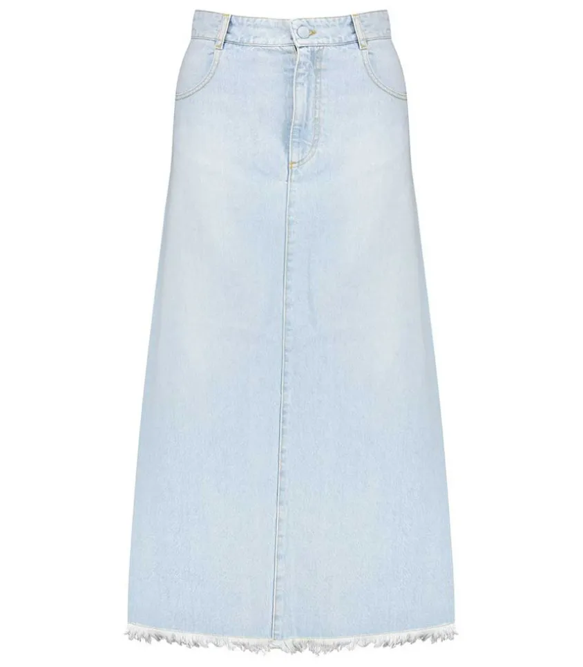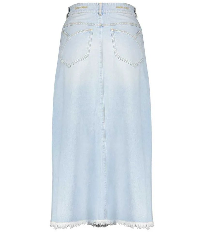 Jupe En Jean Jacinthe De La Marque Happy Haus. Confectionnée Dans Un Tissu Épais En Coton Recyclé, Ce Modèle Bénéficie D’Une Coupe Évasée En Denim Bleu Clair, D’Une Poche En Forme De Fleur À L’Arrière Et De Bords Frangés.
