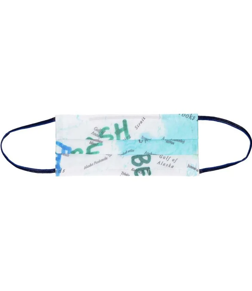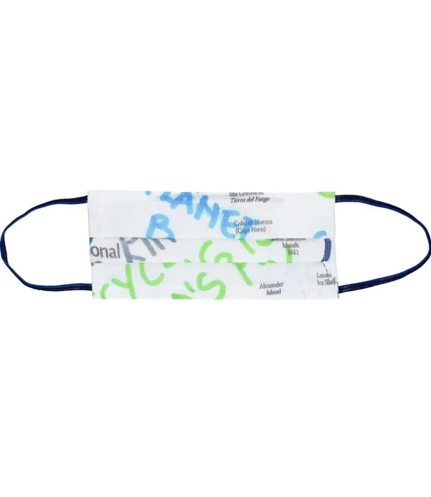Bas Les Masques ! Accessoire Indispensable Dans Le Contexte Actuel, Le Masque Devient Bien Plus Qu’Un Outil Du Quotidien, Il Se Veut Mode Et Distinctif. Optez Pour Ce Masque Faliero Sarti Réalisé À La Main À Partir De Chutes De Tissus Utilisés Pour La Fabrication Des Fameuses Étoles Faliero Sarti. Une Toile En Coton Base Blanc Cassé Sur Laquelle On Distingue Des Inscriptions De Villes À La Manière D’Une Carte Géographique, Accompagnées De Wordings Tels Des Graffs À La Bombe Dans Des Teintes Vertes Et Bleues.