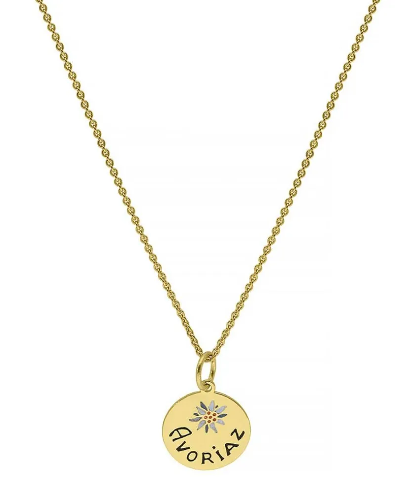 Cette Médaille Avoriaz Sur Lien Et Chaîne De Par Cœur Se Veut Symbole Des Vacances. En Argent Doré À L’Or Fin 18 Carats, Une Gravure Se Niche Dans Ses 1,2 Cm De Diamètre.