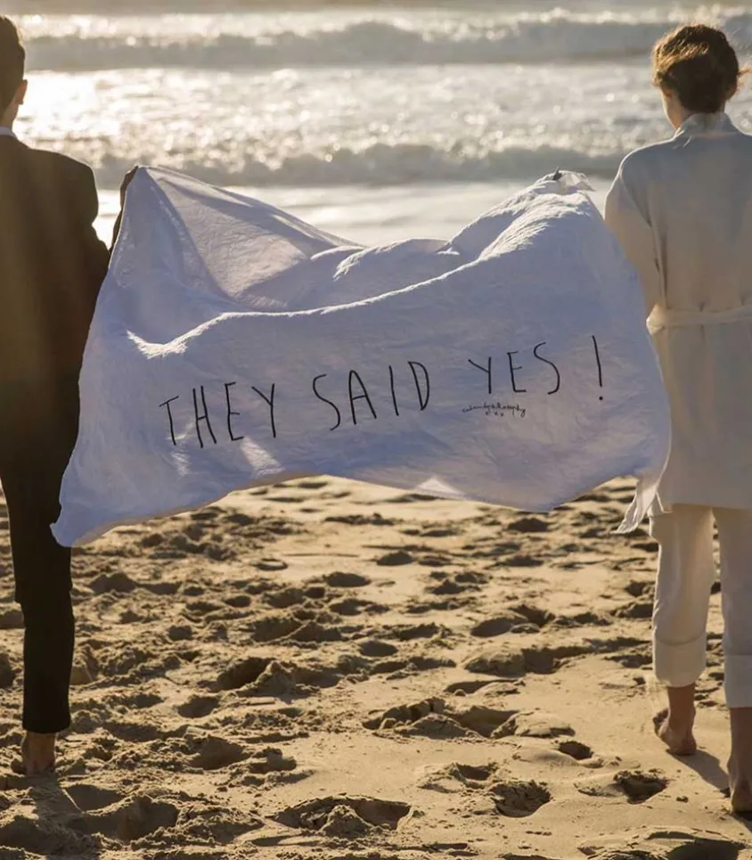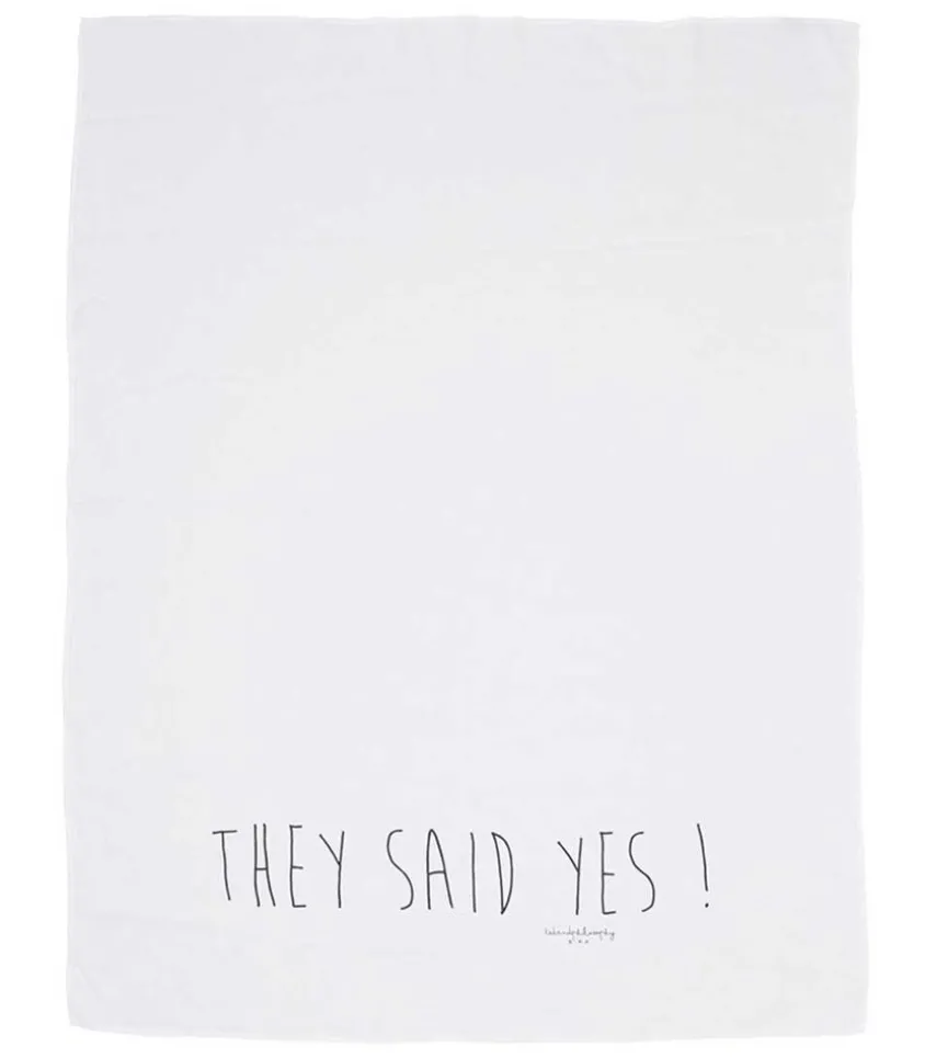 Plaid De Plage Lulu Mariage Signé Bed And Philosophy, Un Cadeau Parfait Pour De Jeunes Mariés. Entièrement En Lin Blanc, Il Affiche Le Message « They Said Yes ! ».