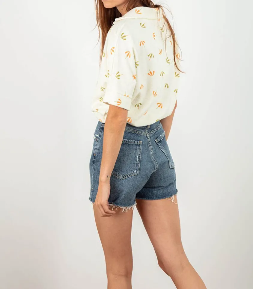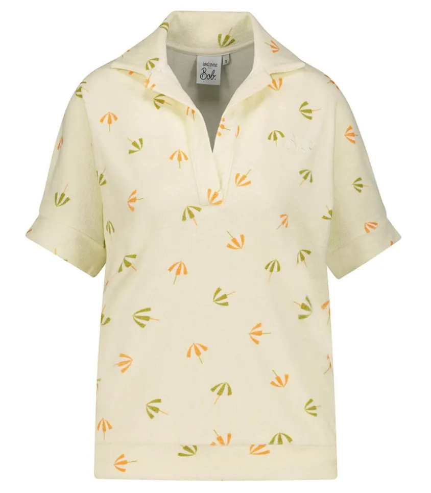 Polo Minorque Parasols De La Marque Welcome Bob, Un Modèle De Polo Classique Conçu Au Portugal En Coton Biologique Qui Doit Son Originalité À Son Motif Parasols Orange Et Vert. On L’Imagine Avec Un Short En Denim Et Une Paire De Sandales.
