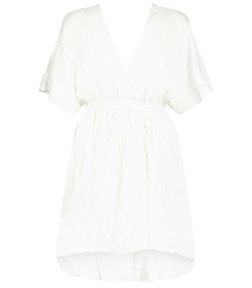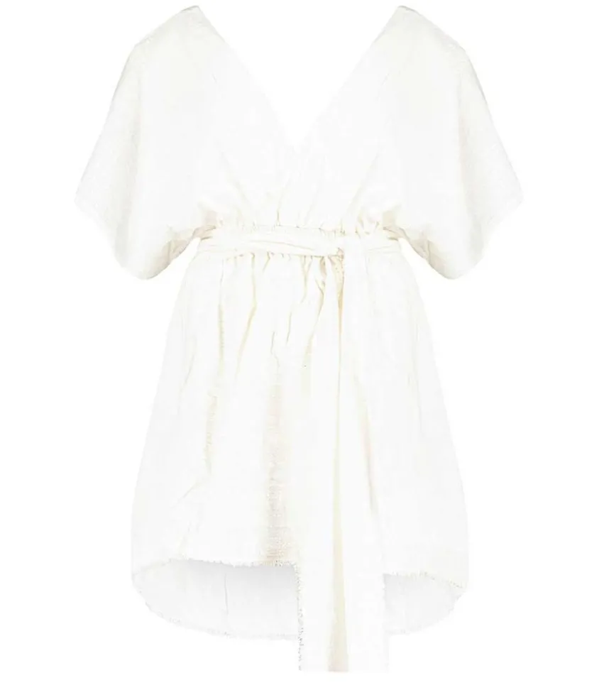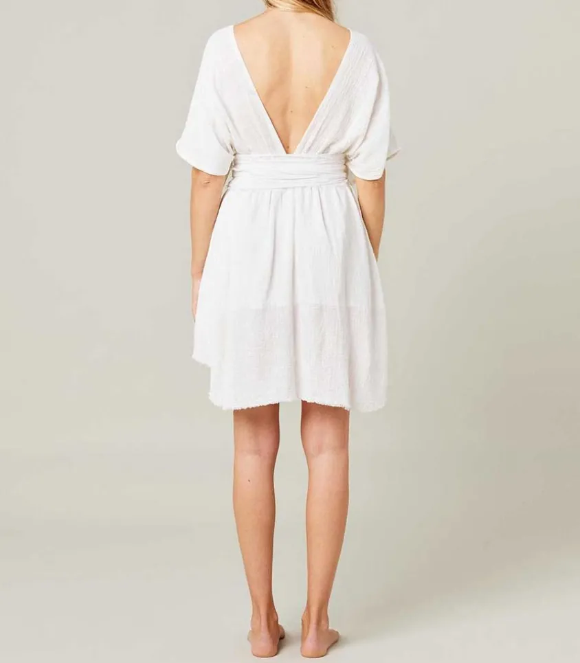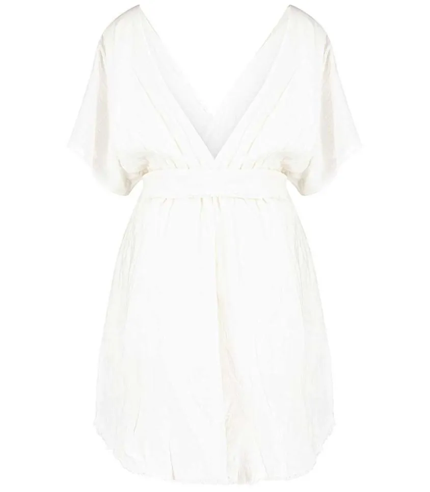 La Robe Courte Empire Dévoile Un Col V, Des Manches Chauve-Souris Et Une Taille Haute Sous Poitrine Élastiquée. Le Coloris Blanc Et La Mousseline De Coton Texturé Confèrent À Ce Modèle Fabriqué À Bali Par Un Atelier Familial Et Traditionnel Un Aspect Léger Et Aérien. Une Ceinture Longue Et Amovible À Bords Francs Est À Nouer À La Taille.