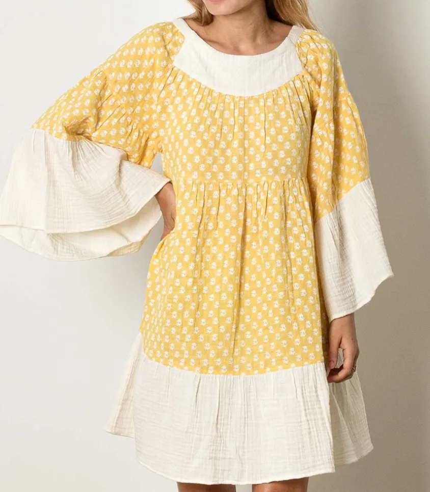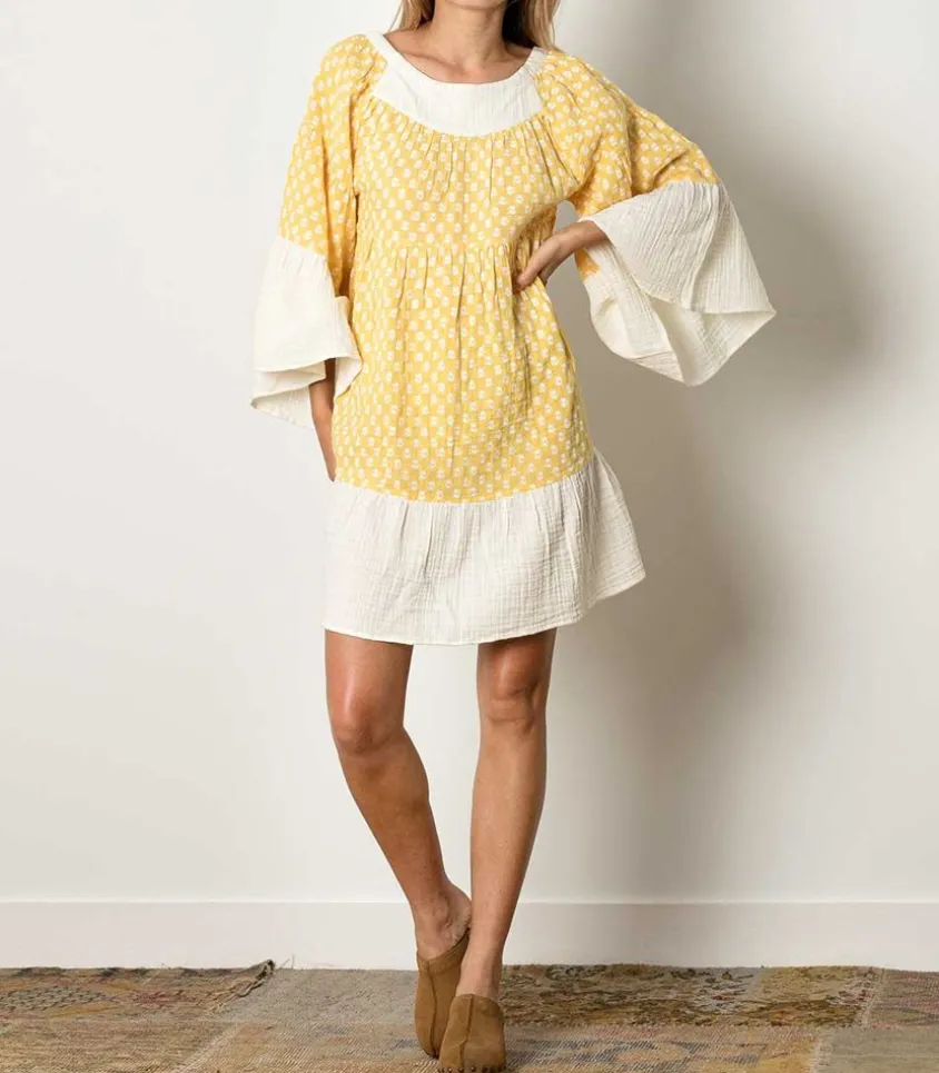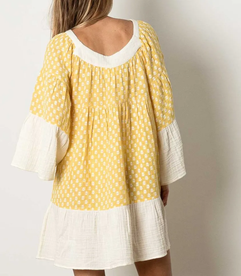 Solaire Et Vitaminée, La Robe Mini Talitha De La Marque Anaak Se Pare De Gaze De Coton Froissé Jaune À Motif Pour Un Effet Aérien.