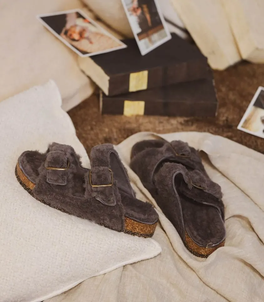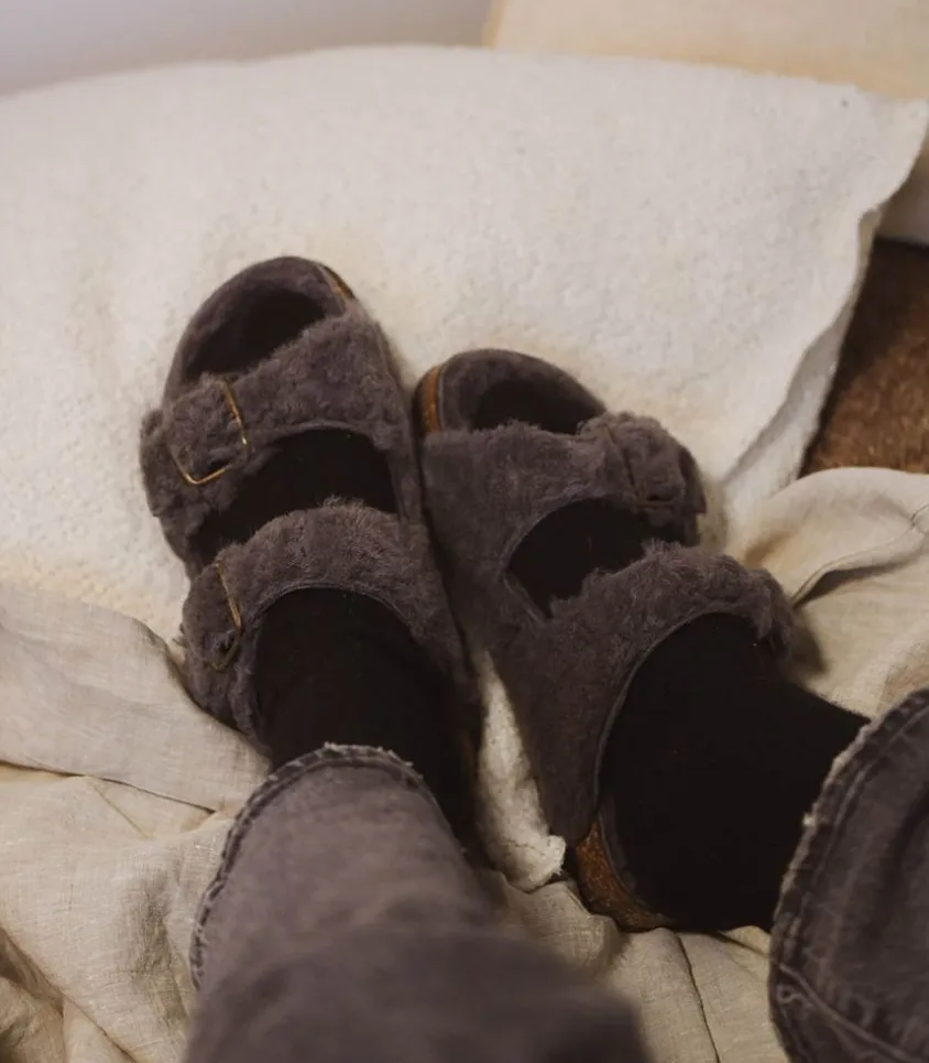 Sandales Fourrées Mouton Gris De La Maison Bosabo, Réalisées En Atelier Dans La Région De Nantes, Et Fabriquées À Partir De Matériaux Naturels.