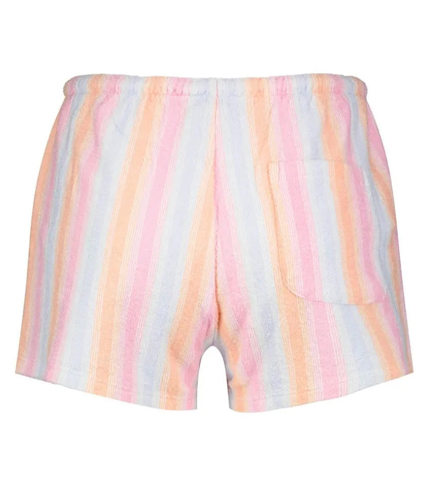 Petit Short Bobypark Signé American Vintage, En Coton Bouclette À Imprimé Axelle, Des Rayures Aux Tientes Pastelles Rose, Orange Et Bleu Ciel. Ceinture Avec Lien À Noueret Petite Poche Plaquée Au Dos. Esprit Sportswear Et Ludique. Voir La Taille Du Mannequin