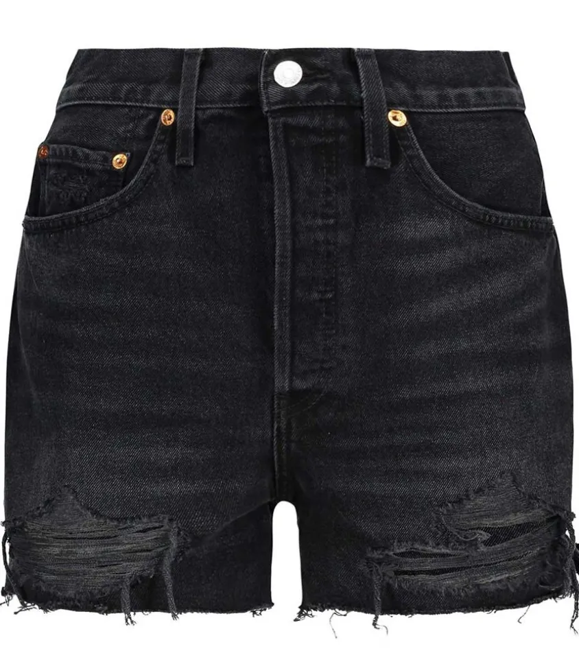 Short En Jean 50S Cutoff Destroyed Shadow Black Signé Re/Done, Ajusté À La Taille Avec Une Jambe Légèrement Plus Large. Très Court, Il Est Taille Haute Pour Mettre En Valeur La Silhouette. Aspect Déchiré Du Denim Pour Un Look Destroy.