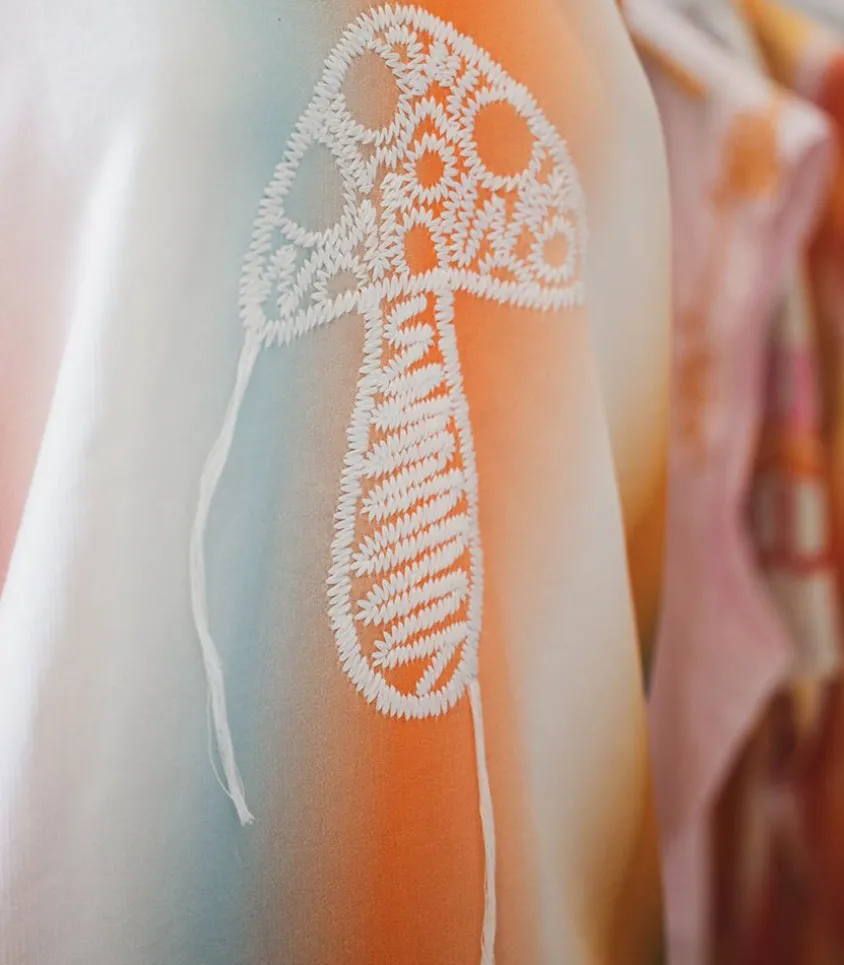 Sweat-Shirt Ombre Stripe Mushroom De La Marque Mika Mikati, Un Modèle Coloré Conçu En Jersey De Coton Contrasté Par Un Gros Champignon Brodé Sur La Poitrine, L’Un Des Motifs Incontournables De Mira.