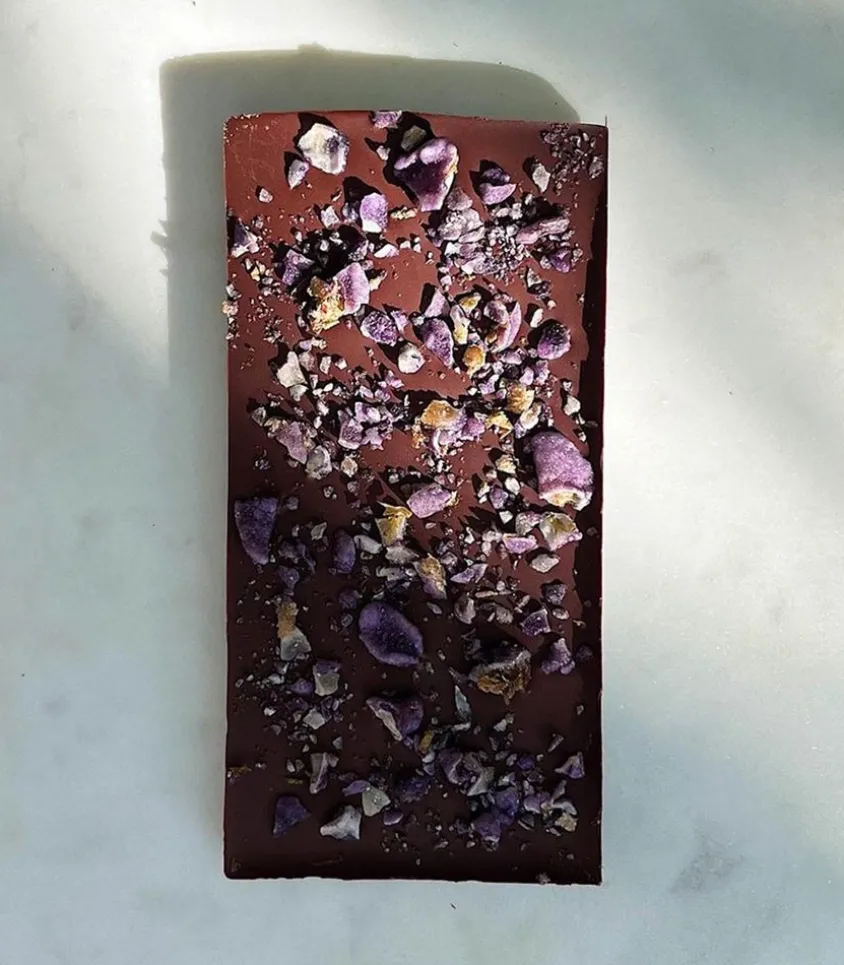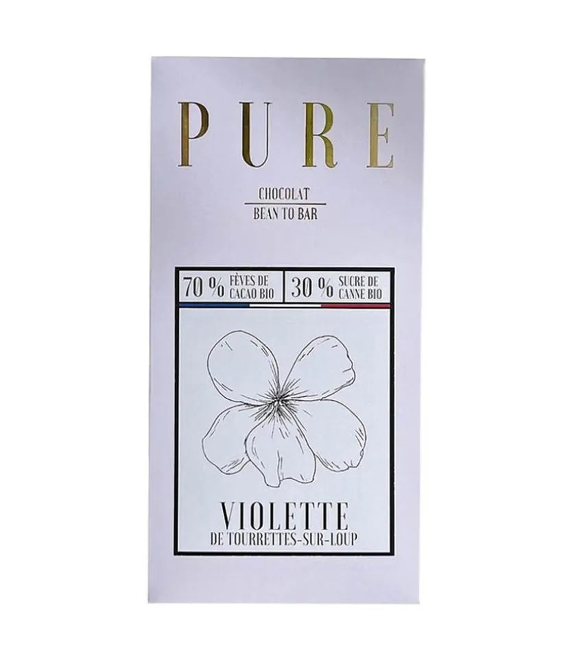 Tablette De Chocolat Bio 70% À La Violette De Tourrettes-Sur-Loup De La Marque Pure. Une Tablette « Bean To Bar », Dont Les Fèves, Provenant Du Pérou Dans La Région D’Ucayali, Ont Été Minutieusement Sélectionnées, Triées, Torréfiées, Concassées, Broyées Et Conchées Pendant Plusieurs Heures Pour Obtenir Un Chocolat Unique, Riche En Goût Et En Arômes Naturels.