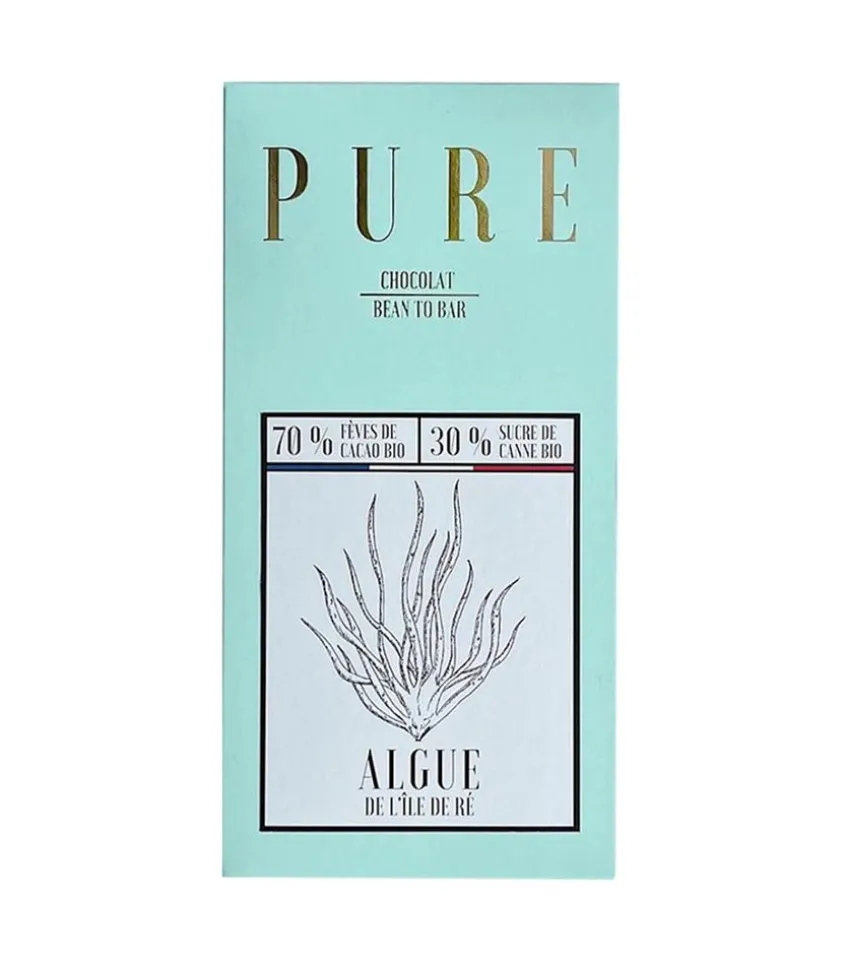 Tablette De Chocolat Bio 70% Aux Algues De L’Île De Ré De La Marque Pure. Une Tablette « Bean To Bar », Dont Les Fèves, Provenant Du Pérou Dans La Région D’Ucayali, Ont Été Minutieusement Sélectionnées, Triées, Torréfiées, Concassées, Broyées Et Conchées Pendant Plusieurs Heures Pour Obtenir Un Chocolat Unique, Riche En Goût Et En Arômes Naturels.