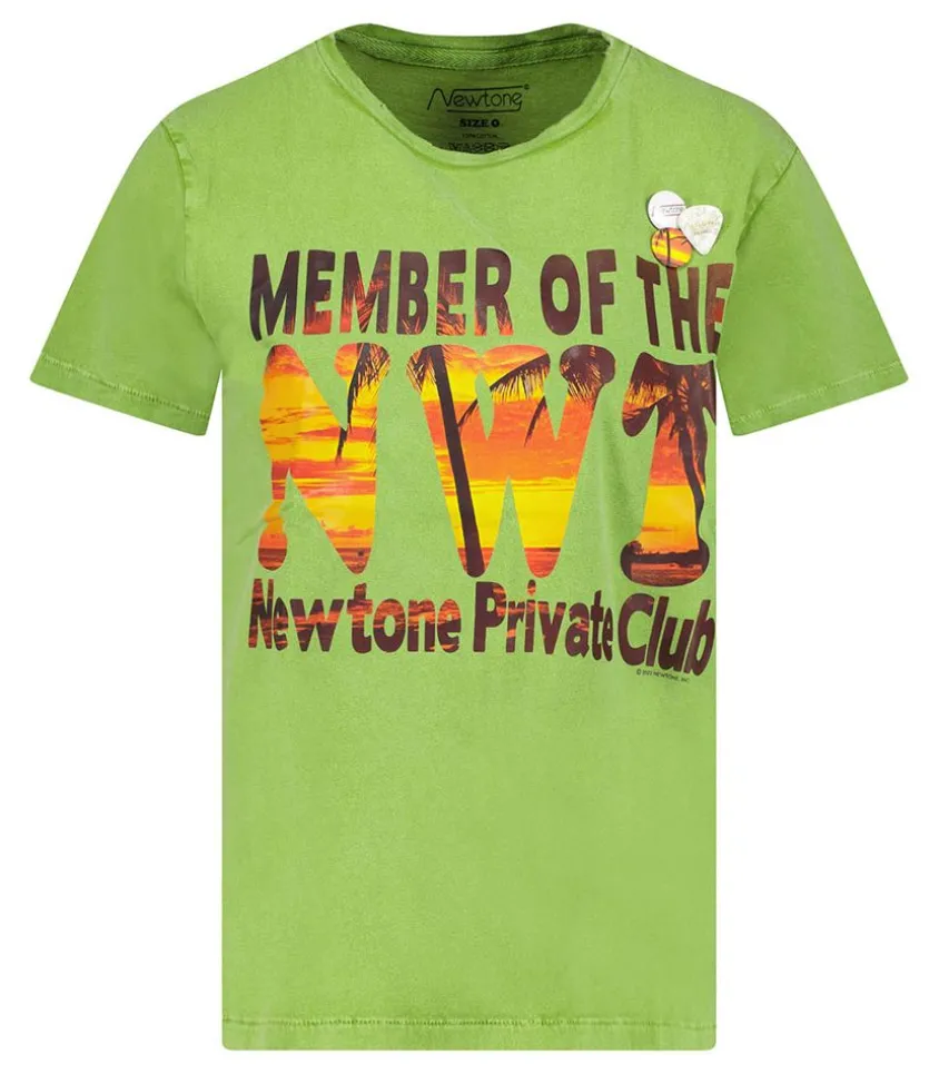 Tee-Shirt Starlight Sunset Aloe De La Marque Newtone, Un Modèle Estival Doté D’Une Inscription « Member Of The Nwt Newtone Private Club » Laissant Entrevoir Un Imprimé Tropical. Dans Un Esprit Décontracté, On L’Imagine Avec Un Jean Ample Et Une Paire De Sabot.