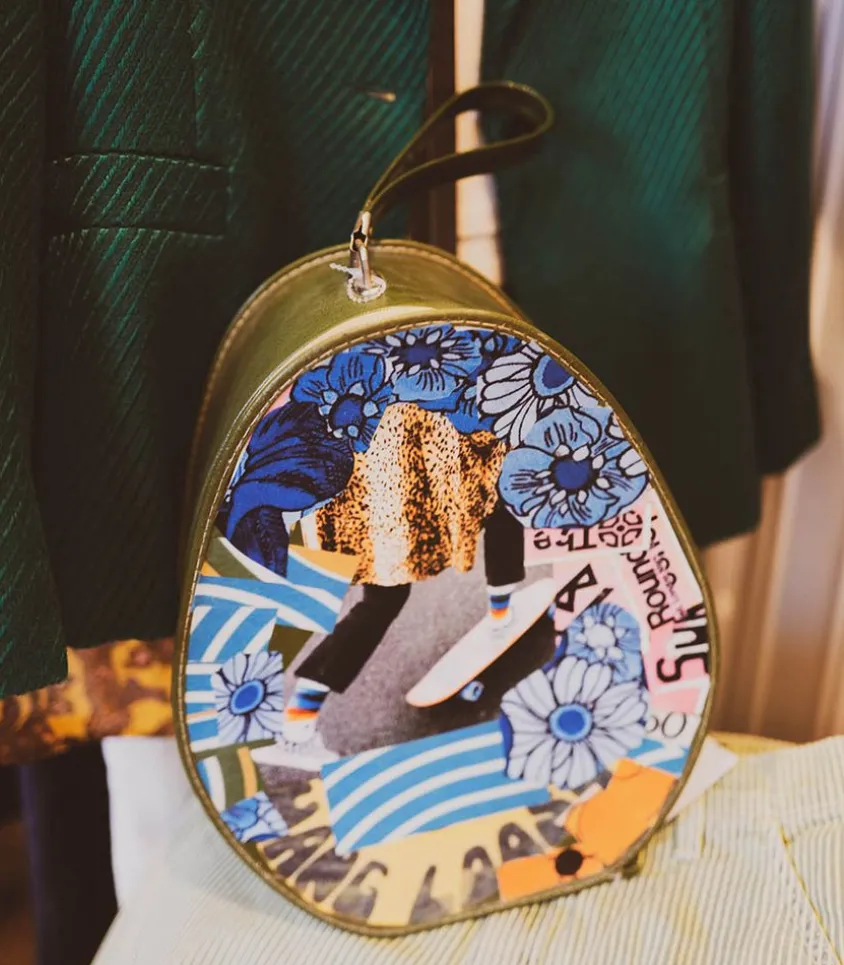 Pièce Exclusive Et Coup De Coeur Jane De Boy, Ce Vanity En Cuir Kaki Est Totalement Unique Et Customisée Avec Des Collages D’Inspiration 70S : Skateboard, Motifs Fleurs Xxl, Wordings Anglophones… De Forme Ovale Façon Poire Et Doté D’Une Petite Anse Sur Le Haut, Il Se Transporte Facilement.