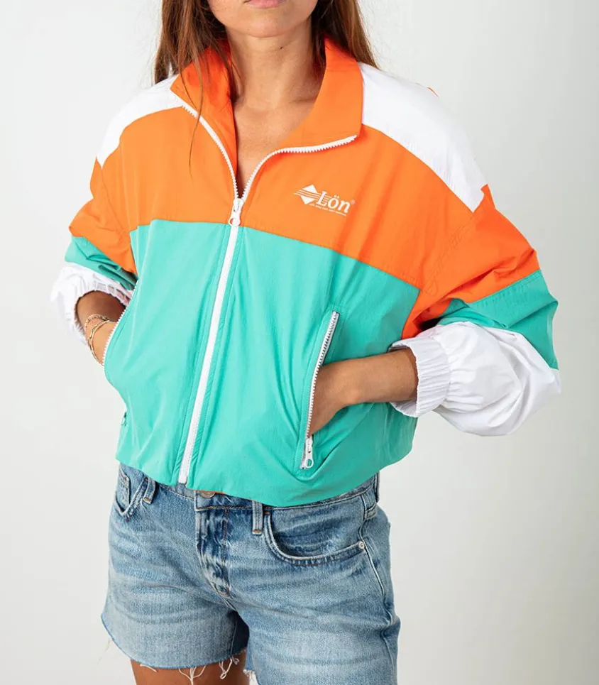 Un Air 90’S Souffle Chez Margaux Lonnberg Qui Dévoile Sa Veste Bomber Rodge Orange, Un Modèle Léger Conçu En Matériaux Techniques Blanc, Turquoise Et Orange. Idéal Pour Apporter Une Touche Rétro Et Athleisure À Sa Tenue.